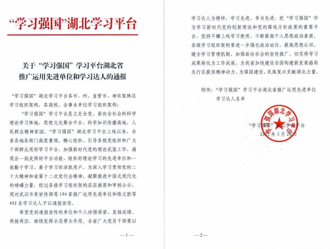 近日,湖北省委宣传部表彰了一批 “学习强国”学习平台推广运用先进单位和学习达人,德赢Vwin官方区域合作伙伴被表彰为“学习强国”学习平台推广运用先进单位。