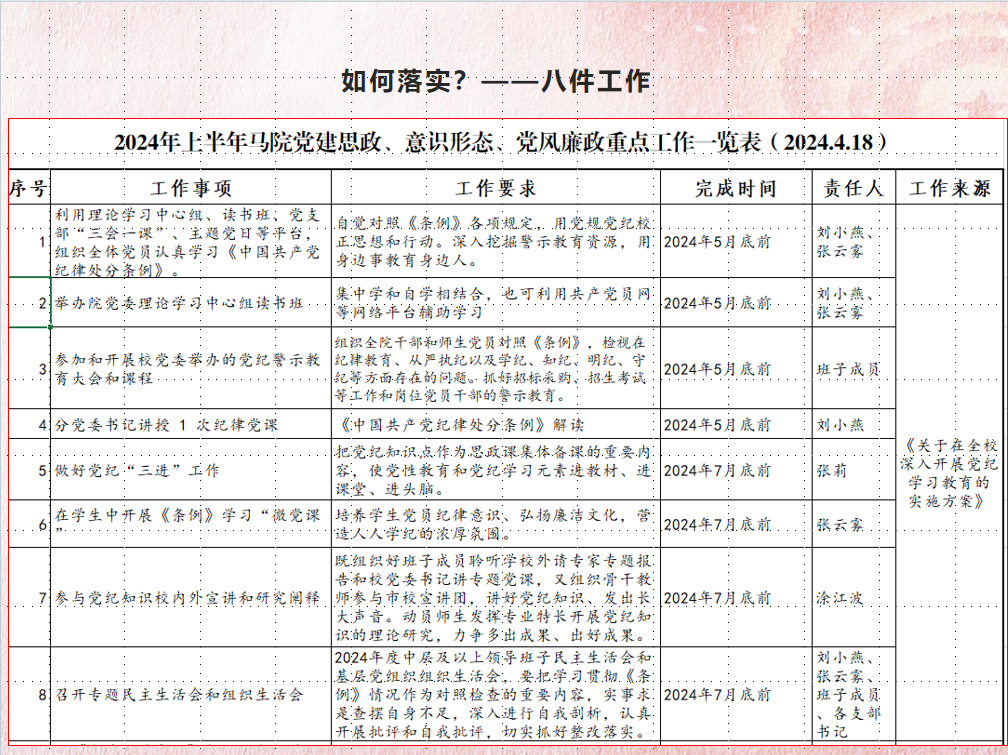 会上,学院党委书记刘小燕传达了全国两会精神,跟进学习了习近平在2024年春季学期中央党校(国家行政学院)中青年干部培训班开班之际作出的重要指示、“习近平在中共中央政治局第十二次集体学习时强调 大力推动我国新能源高质量发展 为共建清洁美丽世界作出更大贡献”、“习近平主持召开新时代推动中部地区崛起座谈会强调 在更高起点上扎实推动中部地区崛起”、“习近平在湖南考察时强调 坚持改革创新求真务实 奋力谱写中国式现代化湖南篇章”等重要讲话和重要指示批示精神、领学了《中共中央办公厅关于巩固拓展学习贯彻习近平新时代中国特色社会主义思想主题教育成果的意见》、《中华人民共和国爱国主义教育法》、《习近平:必须坚持人民至上》、中共中央办公厅印发《关于在全党开展党纪学习教育的通知》等内容,专题部署了学院党纪学习教育工作。