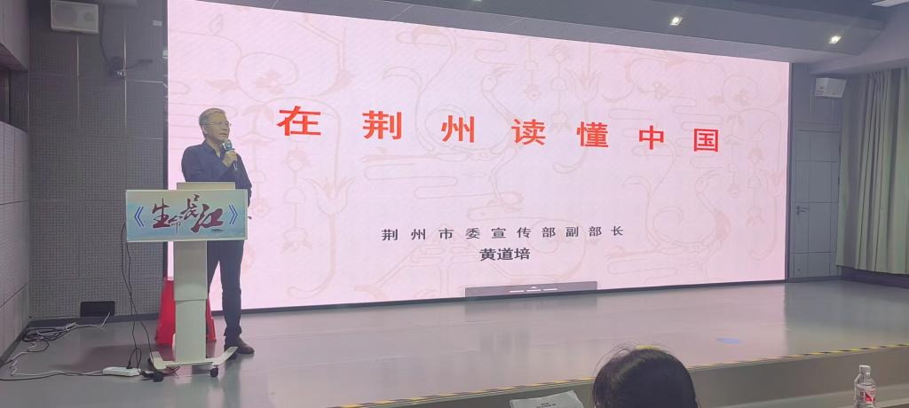 (通讯员储康华)2024年10月16日晚,我校大型思政公选课《生命长江》第十二季第四讲在16教A313教室开讲,荆州市委宣传部副部长、荆州市社科联党组书记、荆州市委讲师团主任黄道培担任主讲人,从人类文明史的角度,向同学们讲解了荆州在中国历史进程中的战略性地位。