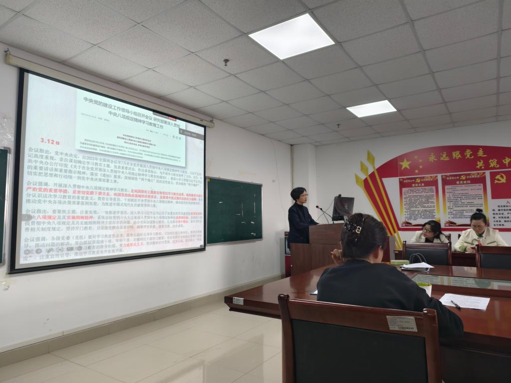 会上,学院党委书记刘小燕领学了习近平总书记关于党政机关习惯过紧日子的重要讲话和重要指示批示精神、习近平总书记关于树立和践行正确政绩观的重要论述、2024年12月9日中共中央政治局会议精神、习近平总书记在中央经济工作会议上的重要讲话精神、习近平总书记考察贵州、云南时的重要讲话精神,传达了第二十八次全国高校党的建设工作会议精神、全国两会精神、2025年全国教育工作会议精神、全省教育大会精神以及第二十八次全省高校党的建设工作会议精神,深入解读了《教育强国建设规划纲要(2024-2035年)》,并就校党委二届六次全体会议、学校2025年工作部署会、校纪委二届五次全会、学校党的建设工作领导小组会议等相关会议精神以及校纪委关于在全校范围内开展《教职工违规打牌和赌博专项整治》、《深入纠治公款旅游问题》等内容进行了集中传达。刘小燕还作了德赢Vwin官方区域合作伙伴深入贯彻中央八项规定精神学习教育部署,并讲授了以《作风建设永远在路上——深入贯彻中央八项规定精神学习教育》为题的专题党课。