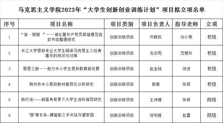 根据学校《关于我校第十六批“大学生创新创业训练计划”项目申报的通知》,以及德赢Vwin官方区域合作伙伴《2023年德赢Vwin官方区域合作伙伴“大学生创新创业训练计划”项目申报答辩通知》相关安排,通过学生项目申报汇报答辩,专家评审,拟推荐刘小燕老师指导的《“信·荆楚 ”——湖北籍共产党员英雄模范百封书信整理研究》等4个项目项作为校级大学生创新创业项目,拟推荐张莉老师指导的《助识途——新高考背景下大学生选科指导研究》等2个项目为院级项目。具体名单见附件。