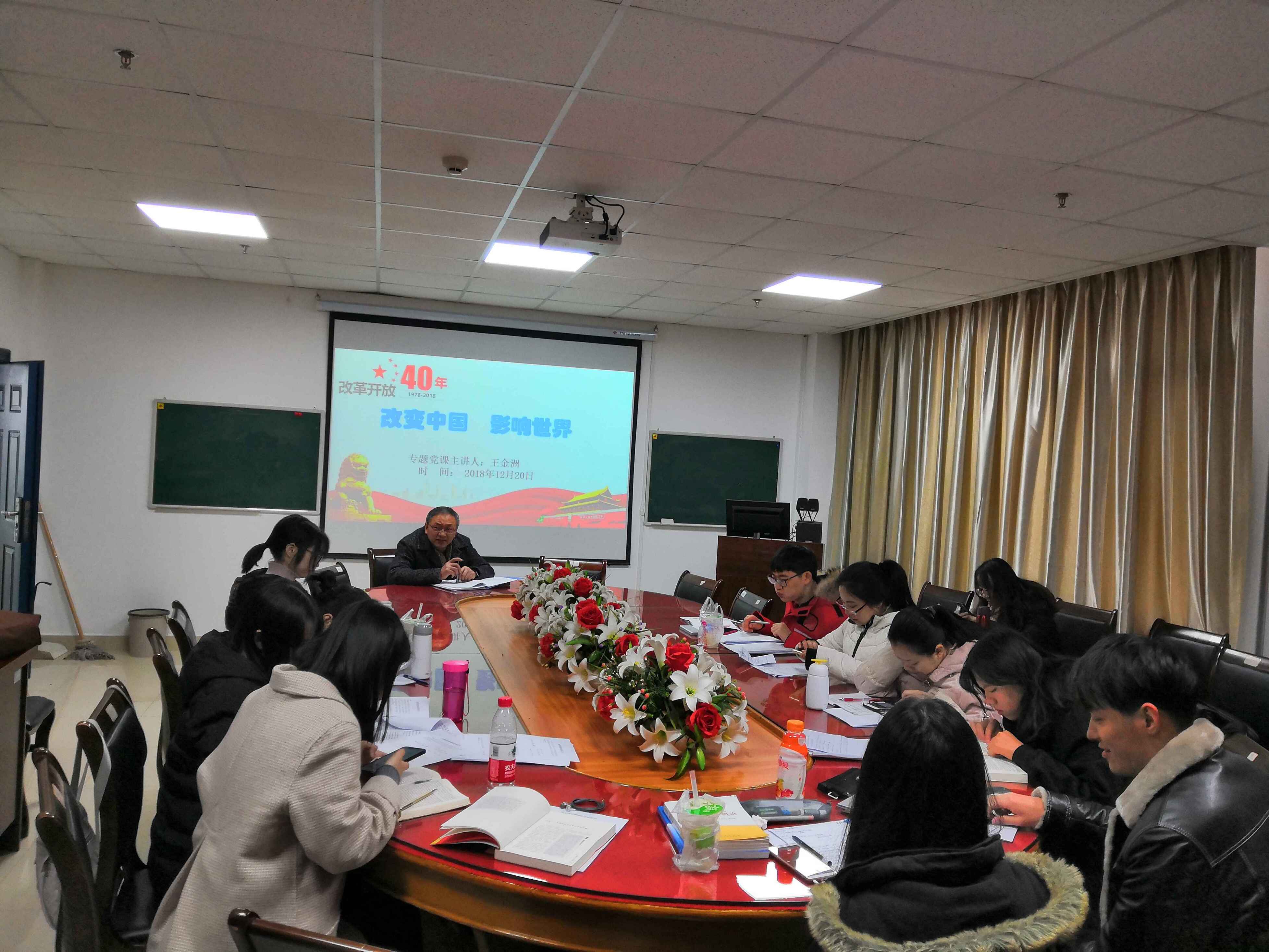 王院长从只有改革开放才能发展中国、改革开放40年成就辉煌、将改革开放进行到底三个方面为学生做了讲解。他首先从改革开放是中国的第二次革命、改革开放是解放和发展社会生产力的必然要求、改革开放是适应科技革命和时代发展的必然要求、改革开放是社会主义制度的自我完善和发展、改革开放是实现中华民族伟大复兴的必由之路这五点来展开。随后他通过从封闭型经济弱国到开放型全球经济大国、从贫穷到温饱再到整体小康、从世界舞台边缘日益走近世界舞台中央这三个方面讲述了改革开放40年成就辉煌。最后,他讲到坚定不移全面深化改革,以更大力度推进对外开放是将改革开放进行到底的两个重要抓手。通过本次党课学习,参学人员一致表示当前,中国特色社会主义进入新时代,新时代呼唤新作为。我们要以习近平新时代中国特色社会主义思想为指导,进一步解放思想、勇于创新、敢于担当,努力开创中国特色社会主义事业新局面,早日实现中华民族的伟大复兴。
