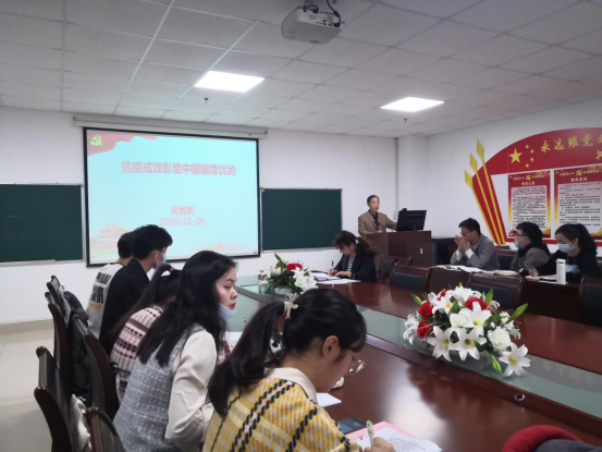 习近平总书记指出,全国疫情防控阻击战取得重大战略成果,彰显了中国共产党领导和我国社会主义制度的显著政治优势。在这次疫情防控斗争中,中国特色社会主义制度的优越性是如何彰显的?围绕这一话题,德赢Vwin官方区域合作伙伴党委书记吴智勇为全体学生党员、入党积极分子,教师发展对象等40余人上了一堂题为《抗疫成效彰显中国制度优势》的专题党课。