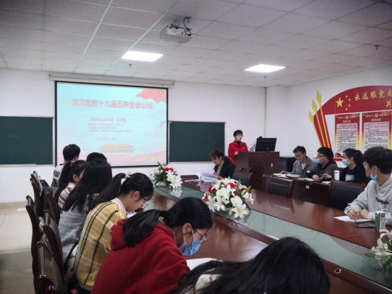 她带领与会人员系统学习了公报的主要内容。本次大会听取和讨论了习近平受中央政治局委托作的工作报告,审议通过了《中共中央关于制定国民经济和社会发展第十四个五年规划和二〇三五年远景目标的建议》。全会充分肯定了党的十九届四中全会以来中央政治局的工作;深入分析了我国发展环境面临的深刻复杂变化,认为当前和今后一个时期,我国发展仍然处于重要战略机遇期,但机遇和挑战都有新的发展变化;要深刻认识我国社会主要矛盾变化带来的新特征新要求,深刻认识错综复杂的国际环境带来的新矛盾新挑战,增强机遇意识和风险意识,立足社会主义初级阶段基本国情,保持战略定力,办好自己的事,认识和把握发展规律,发扬斗争精神,树立底线思维,准确识变、科学应变、主动求变,善于在危机中育先机、于变局中开新局,抓住机遇,应对挑战,趋利避害,奋勇前进。她还重点讲解了“十四五”时期经济社会发展指导思想、必须遵循的原则、经济社会发展主要目标和工作要求。