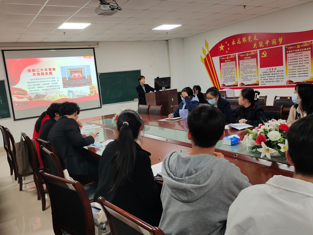 支部书记马小佼从青年担当讲起,以生动鲜活的案例,理论联系实际,重点阐述了党的二十大报告中“三个务必”,“三件大事”,“两个行”和“一个中心”,讲述了青年躬逢盛世,自当勇于担当使命。她强调:“要实现中华民族伟大复兴,必须坚持中国式现代化,坚持两步走战略、五大基本原则和五个必由之路。”