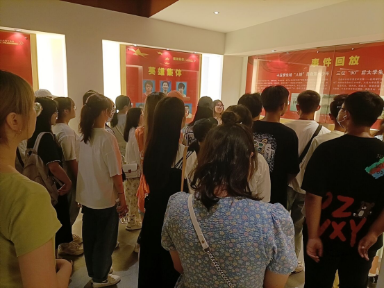 进入二楼,不大的空间里四下摆放着英雄们的学习物品、洗漱用具和换洗衣物,他们的遗物被用心保护,一尘不染,仿佛少年们青涩的音容犹在。在辅导员张云雾的带领下,通过讲解员的动情讲述和音视频资料的播放,全体新生一同回顾了10·24事件的详细过程,同学们面容沉重眼角泛泪,更有甚者,泪水打湿了脸颊。尽管已经对纪念馆相当熟悉,张云雾老师仍然努力压制内心的激动,对同学们说:“希望同学们铭记人链精神,珍重自身,树立远大理想目标,积极进取,争做新时代友善关爱的新青年。”