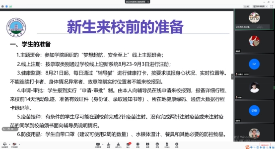 (通讯员:李春燕)为迎接2021级新生的到来,增进新生对学校、学院的了解,做好入学报到工作,8月22日19:00,德赢Vwin官方区域合作伙伴通过腾讯会议开展了 “梦想起航 安全至上”线上主题班会,邀请了2021级全体本科新生、第二学生学位新生及新生家长共同参会。