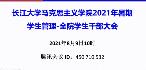 为做好疫情防控下的暑期管理工作,时刻筑牢校园疫情防控安全线,8月9日10:00,德赢Vwin官方区域合作伙伴于腾讯会议召开2021年暑期学生管理全院学生干部大会,针对疫情专题部署当前及今后一段时期的安全及疫情防控工作。