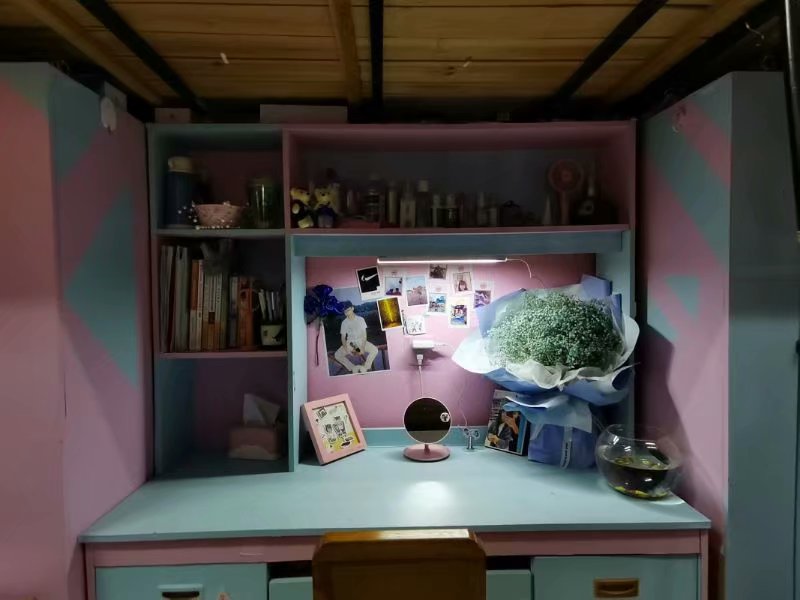 继续走进去深入探索也是惊喜连连,同学们把不大的寝室装饰的充满生活气息和人情味,行李多而不乱,寝室空气清新怡人,夹杂着淡淡的清香浸人心脾;屋顶有气球装饰、贴纸装饰和灯光装饰;墙壁被划分了绘画墙、照片墙、安全墙和留言墙等区域;桌面床铺有玩偶、鲜花、收藏品和时令水果装饰,搭配桌布温柔的台灯灯光使人心情愉悦,清爽又养眼;书架上摆着的《共产党宣言》《习近平谈治国理政》满满都是德赢Vwin官方区域合作伙伴的浓厚文化学术氛围。