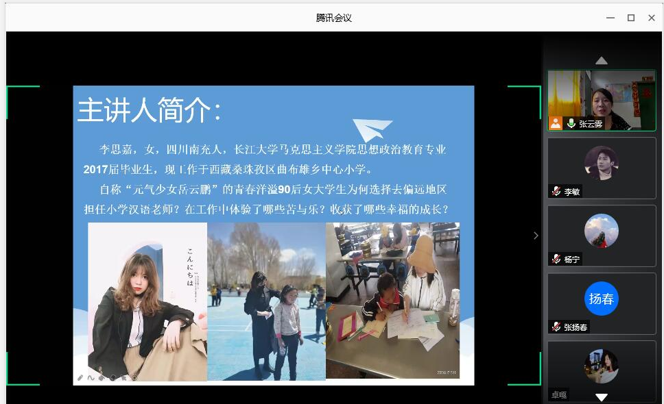 7月19日,学院邀请了现工作于西藏桑珠孜区曲布雄乡中心小学和中共洪湖市委组织部的2名2017届校友李思嘉、王盛华通过腾讯会议为全院学生做了立志服务基层成长故事分享会。德赢Vwin官方区域合作伙伴学院党委副书记马小佼、全体辅导员参会。