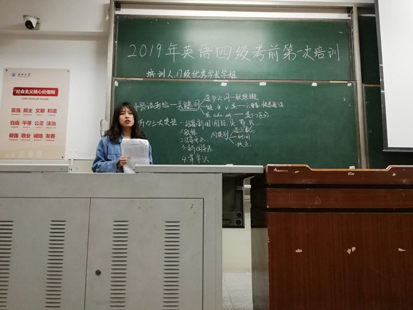 (通讯员:邱诗琪)在英语四级考试临近之际,为加深同学们对考题熟练程度和理解,有效备战四级,德赢Vwin官方区域合作伙伴于4月10日晚7:00,在主教207室开展了第一次英语四级考前培训。本次培训的主讲人是17级四级成绩优秀的毛雨晴和覃美南两位同学,培训的主要内容为作文和听力专题。