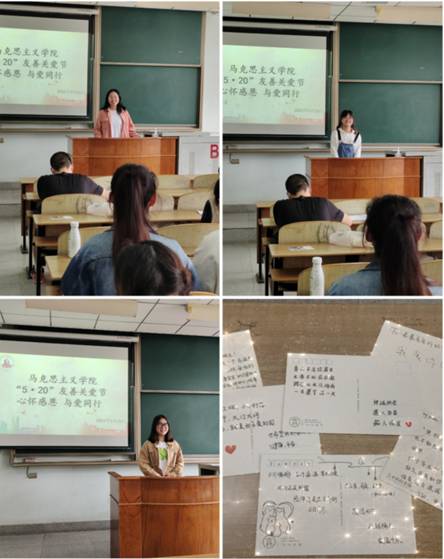 德赢官网紧扣5月20日“我爱你”、5月25日“我爱我”寓意,通过明信片记录爱,大声说出爱,电影感悟爱,行动传递爱等丰富多彩,师生喜闻乐见的形式倡导学院学生关爱同学、关爱自身身心健康;鼓励学生向亲人表达感恩之情,汇报生涯规划;推进师生“1+1”特色导师育人制”资政育人工作。习近平总书记曾多次勉励青年人要勤学修德明辨笃实,成长为有“大爱大德大情怀”的时代新人。诚然,从爱自己、爱同学、爱家人开始,推而广之爱家乡、爱祖国、爱人民是从小爱到大爱的升华。毫不吝啬的大声说出爱,思政学子的眼中有星光,心里有大爱。