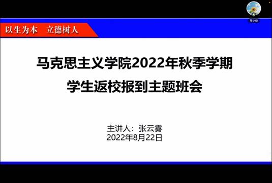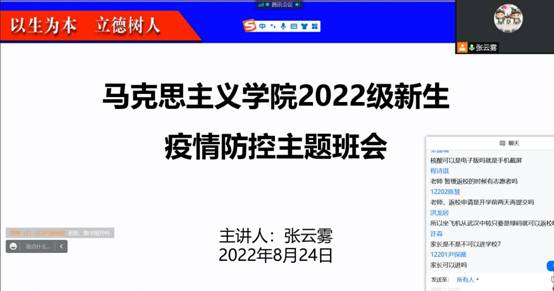 (通讯员:齐晓杭 摄影:龙薛西)为有序做好秋季返校报到工作,讲清疫情防控政策,德赢Vwin官方区域合作伙伴2022年秋季学期学生返校报到主题班会于8月22日-8月25日通过腾讯会议线上召开,辅导员张云雾老师、李敏老师分别面向本、研学生进行了宣讲,学院党委副书记马小佼线上参会。
