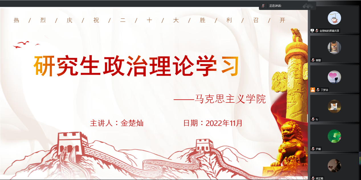 (通讯员 周思雨 谢蕾)11月24日,德赢Vwin官方区域合作伙伴研究生会通过腾讯会议举行了11月份研究生政治理论学习交流会,深入学习贯彻党的二十大精神,加强德赢官网研究生的政治觉悟,培养有理想、敢担当、能吃苦、肯奋斗的新时代好青年。会议由研究生会实践部金楚灿主讲。