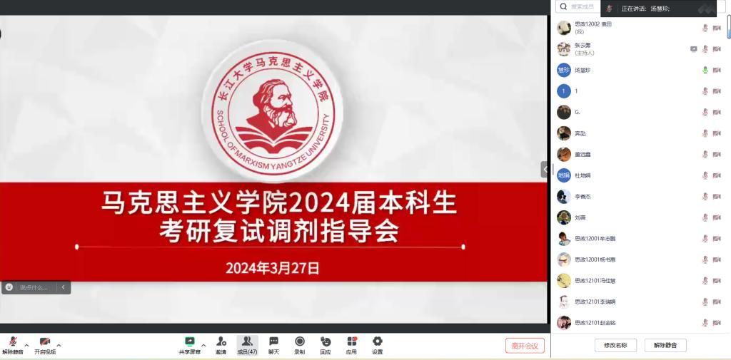 为了帮助学院2024届考研学生更好地掌握考研复试策略和了解调剂流程,德赢Vwin官方区域合作伙伴于3月27日晚通过线上方式组织了考研复试及调剂交流会,邀请往届优秀研究生作指导分享。学院党委副书记汤慧珍、辅导员张云雾及2024届考研学生共同参会。