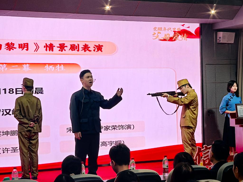 在情景演绎环节,蔡坤鹏、晏婉怡、高宇桐等同学通过《“借花献佛”》情景剧生动再现了瞿秋白、杨之华、沈剑龙三人谈判并践行开放、平等的新式婚恋观的场景;许圣、尹家荣等同学通过情景剧《最后的黎明》还原了国民党劝降瞿秋白,但他宁死不屈壮烈牺牲的场景,真挚的情感和精湛的演技,感人至深的内心独白和生动鲜活的人物形象将革命先辈们的英勇事迹和崇高精神展现得淋漓尽致,引起在场师生强烈情感共鸣。