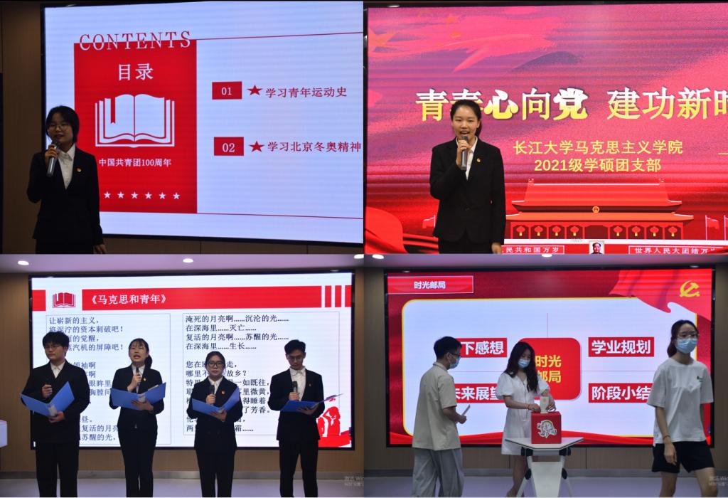 思政12002团支部别出心裁的“团员身份与责任”专访视频和原创诗朗诵《马克思和青年》振奋人心。2021级学硕团支部全体团员给未来的自己写下一封有关理想、奋斗与爱的信笺,统一保存在“时光邮局”﹍﹍精心的设计与精彩的展示赢得师生阵阵掌声。